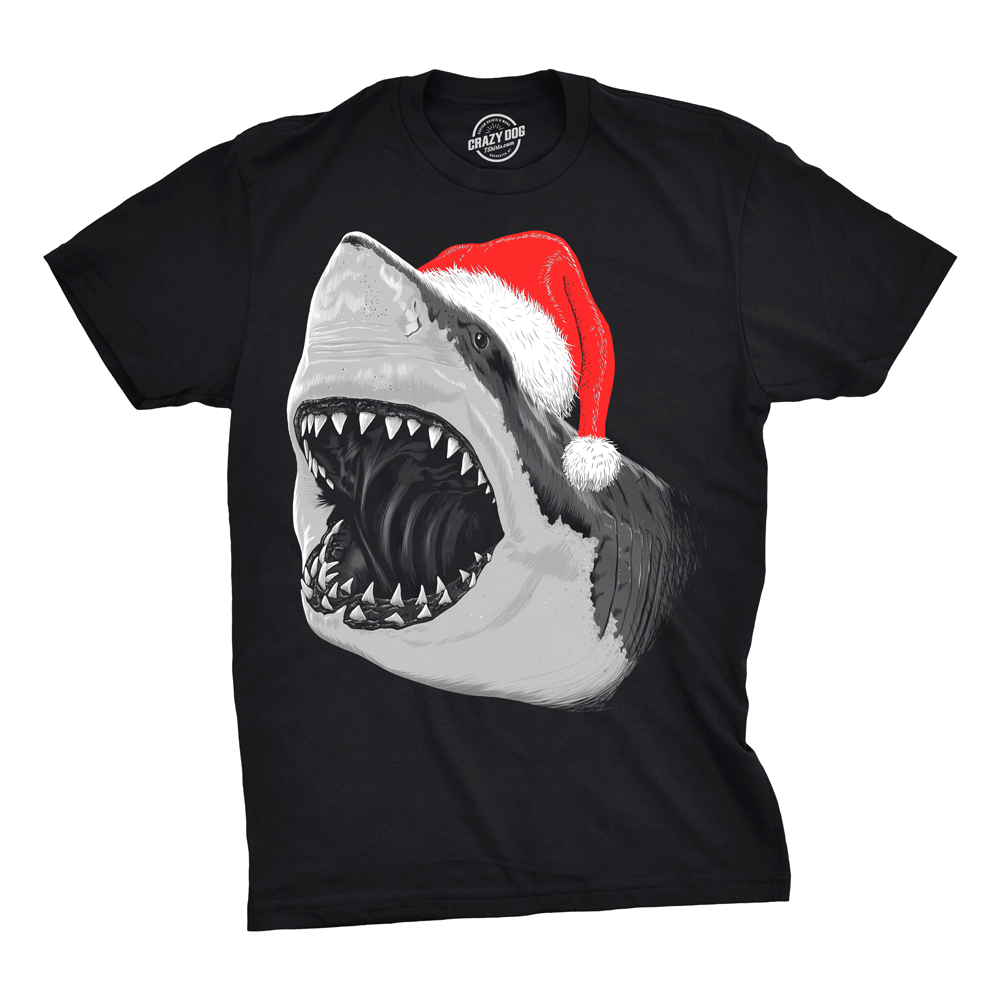 Santa Jaws is coming to town. Well, maybe he’ll come to the beach. If you’re really desperate to give him your Christmas list, you may be able to find him at an aquarium. Of course, that could be like going to the mall to see one of Santa Claus’s surrogates. You know it’s not really the man in charge, but it’s still fairly cool to do.You know what is beyond cool? This new funny t-shirt! Our Santa Jaws design was created right here at CrazyDog T-shirts HQ but our experienced team of graphic designers. It was screen printed by our group of crackerjack screen printers. We take as much time and care as possible to make sure that we provide customers like you the best possible product. In fact, we screen printed this shirt so well that it almost looks like it could give you a present. Or bite your head off. Don’t worry though, that won’t actually happen…or will it?