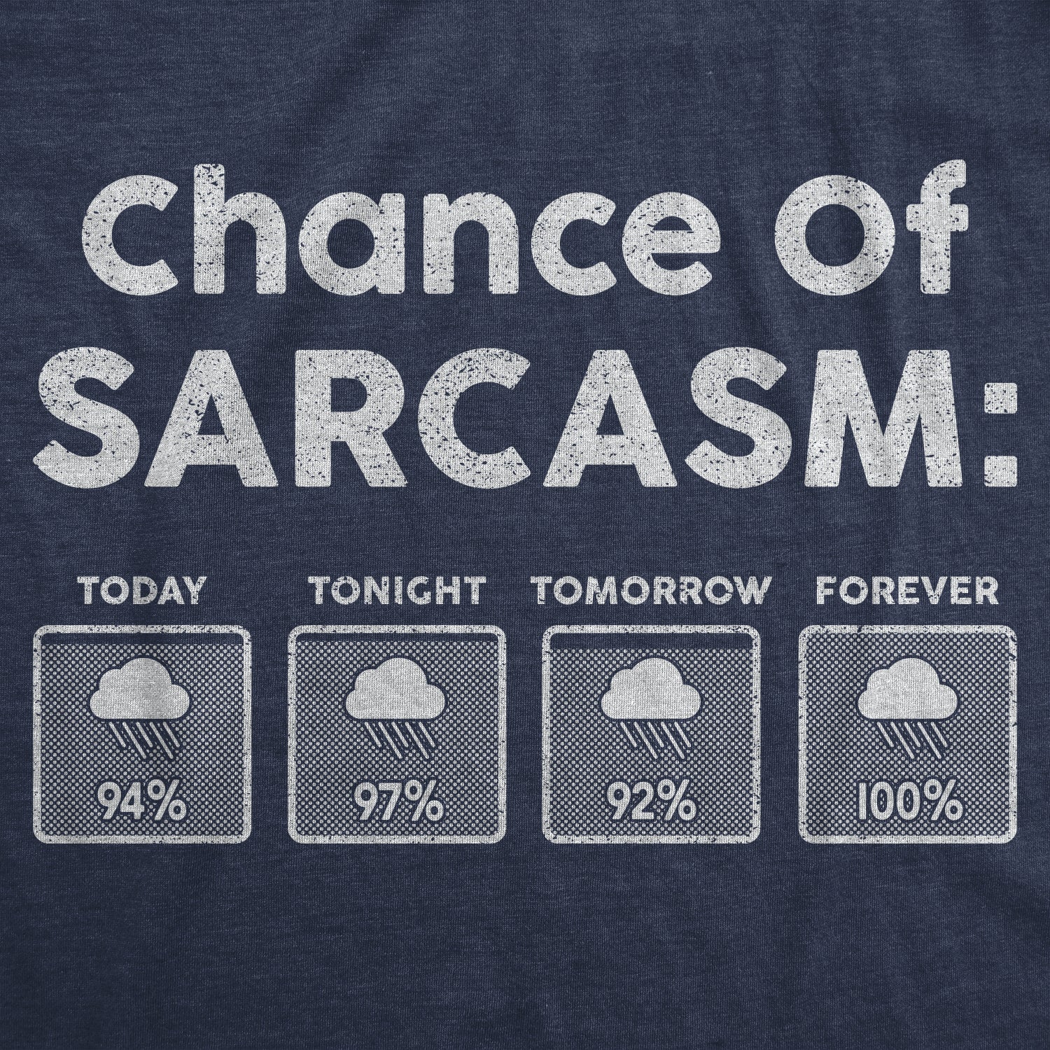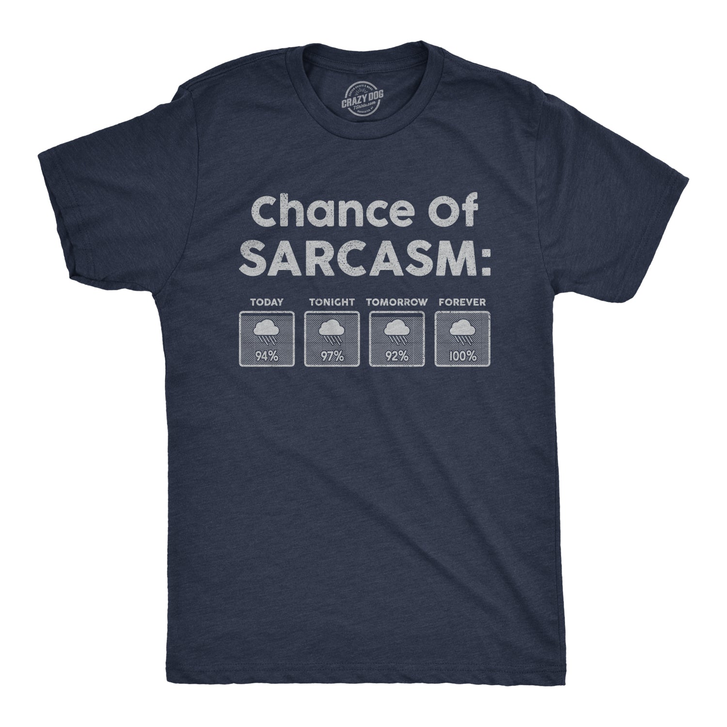 Cloudy with a chance of sarcasm. This funny men’s graphic t-shirt was designed for sarcastic jokesters. It is slim fit, comfortable & super trendy, making it the perfect premium novelty tee for a day with friends. Make friends and family laugh with this hilarious “100% chance of sarcasm” meme. Are you looking for an affordable gift idea for him? Buy this awesome joke t-shirt!
